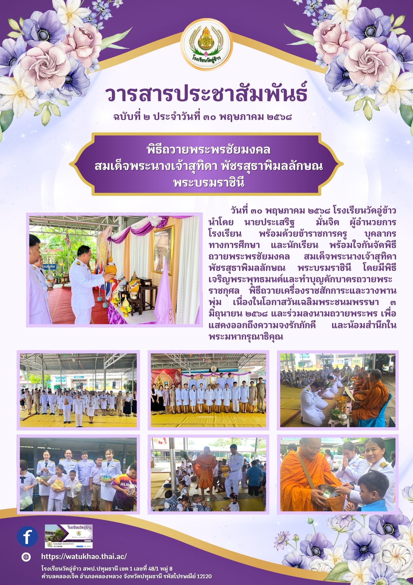 นำโดย นายประเสริฐ มั่นจิต ผู้อำนวยการโรงเรียน พร้อมด้วยข้าราชการครู บุคลากรทางการศึกษา และนักเรียน พร้อมใจกันจัดพิธีถวายพระพรชัยมงคล สมเด็จพระนางเจ้าสุทิดา พัชรสุธาพิมลลักษณ พระบรมราชินี เนื่องในโอกาสวันเฉลิมพระชนมพรรษา ๓ มิถุนายน ๒๕๖๘