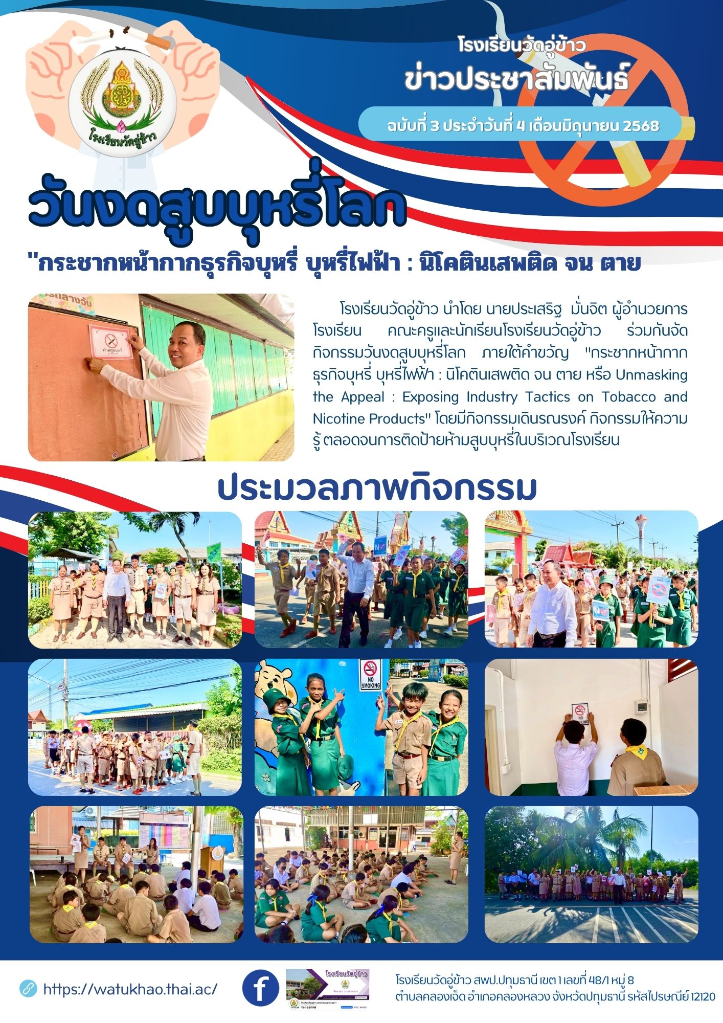 โรงเรียนวัดอู่ข้าว นำโดย นายประเสริฐ มั่นจิต ผู้อำนวยการโรงเรียน คณะครูและนักเรียนโรงเรียนวัดอู่ข้าว ร่วมกันจัดกิจกรรมวันงดสูบบุหรี่โลก ภายใต้คำขวัญ "กระชากหน้ากากธุรกิจบุหรี่ บุหรี่ไฟฟ้า : นิโคตินเสพติด จน ตาย หรือ Unmasking the Appeal : Exposing Industry Tactics on Tobacco and Nicotine Products" โดยมีกิจกรรมเดินรณรงค์ กิจกรรมให้ความรู้ ตลอดจนการติดป้ายห้ามสูบบุหรี่ในบริเวณโรงเรียน
