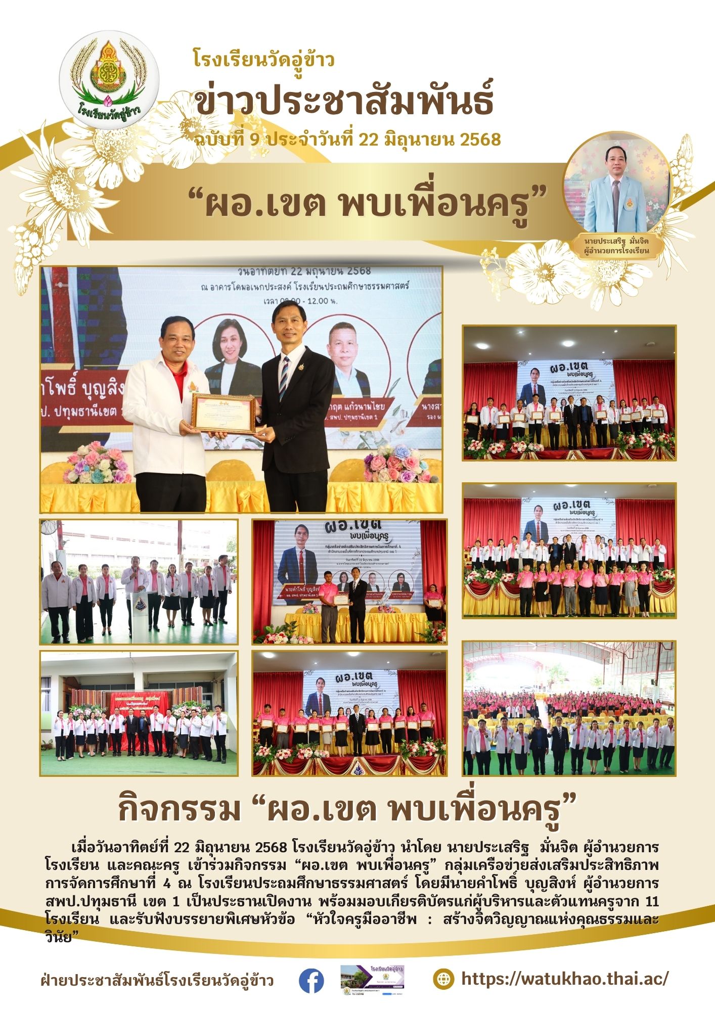 เมื่อวันอาทิตย์ที่ 22 มิถุนายน 2568 โรงเรียนวัดอู่ข้าว นำโดย นายประเสริฐ มั่นจิต ผู้อำนวยการโรงเรียน และคณะครู เข้าร่วมกิจกรรม “ผอ.เขต พบเพื่อนครู” กลุ่มเครือข่ายส่งเสริมประสิทธิภาพการจัดการศึกษาที่ 4 ณ โรงเรียนประถมศึกษาธรรมศาสตร์ โดยมีนายคำโพธิ์ บุญสิงห์ ผู้อำนวยการ สพป.ปทุมธานี เขต 1 เป็นประธานเปิดงาน พร้อมมอบเกียรติบัตรแก่ผู้บริหารและตัวแทนครูจาก 11 โรงเรียน และรับฟังบรรยายพิเศษหัวข้อ “หัวใจครูมืออาชีพ : สร้างจิตวิญญาณแห่งคุณธรรมและวินัย”