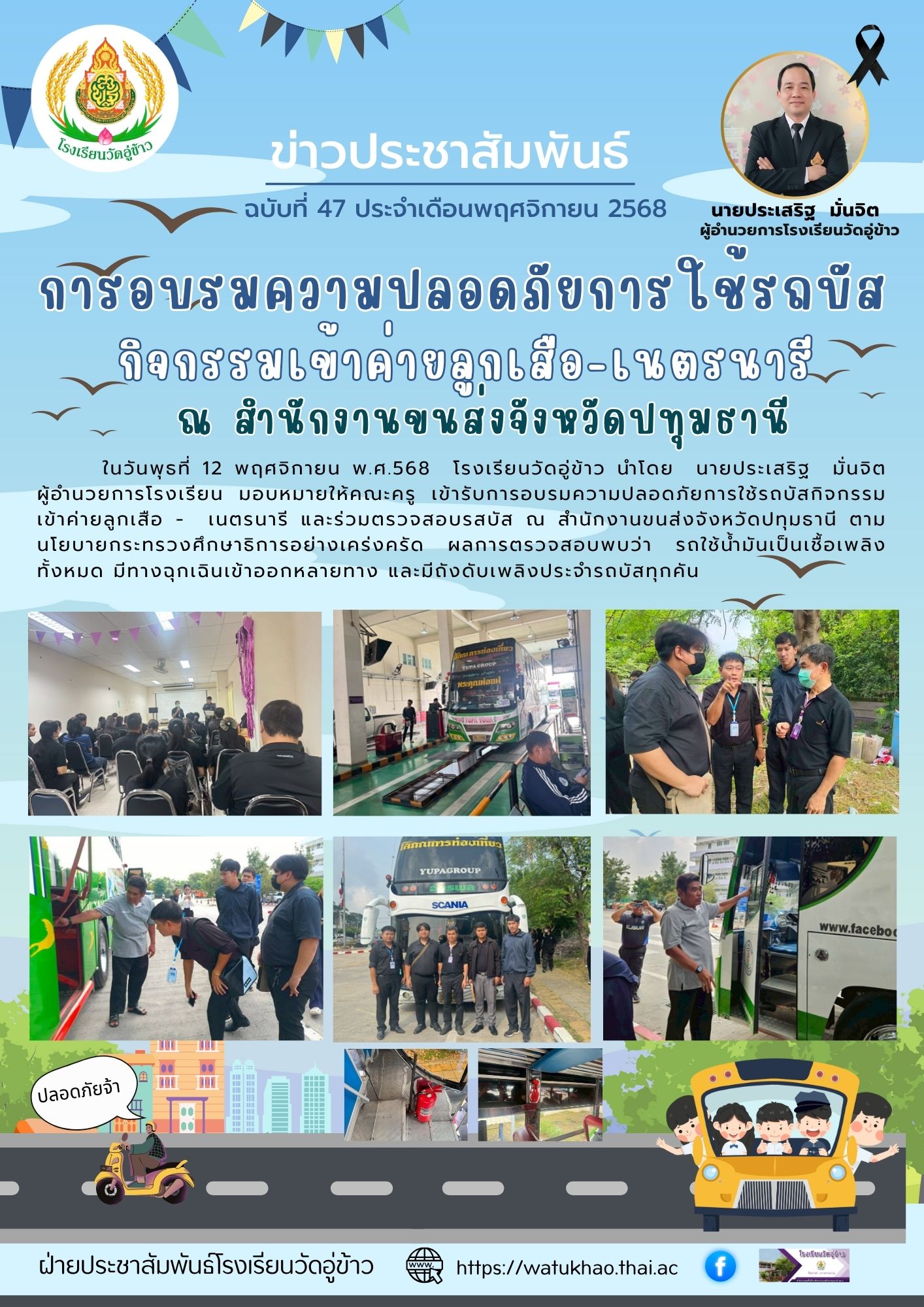ในวันพุธที่ 12 พฤศจิกายน พ.ศ.568 โรงเรียนวัดอู่ข้าว นำโดย นายประเสริฐ มั่นจิต ผู้อำนวยการโรงเรียน มอบหมายให้คณะครู เข้ารับการอบรมความปลอดภัยการใช้รถบัสกิจกรรมเข้าค่ายลูกเสือ - เนตรนารี และร่วมตรวจสอบรสบัส ณ สำนักงานขนส่งจังหวัดปทุมธานี ตามนโยบายกระทรวงศึกษาธิการอย่างเคร่งครัด ผลการตรวจสอบพบว่า รถใช้น้ำมันเป็นเชื้อเพลิงทั้งหมด มีทางฉุกเฉินเข้าออกหลายทาง และมีถังดับเพลิงประจำรถบัสทุกคัน