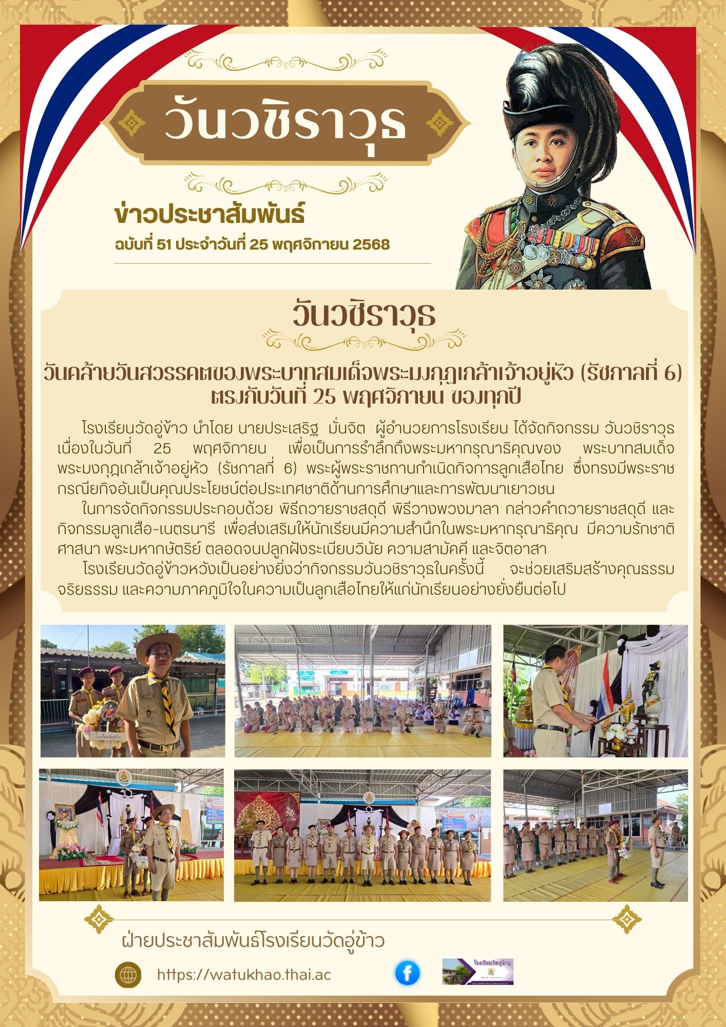 โรงเรียนวัดอู่ข้าว ได้จัดกิจกรรม วันวชิราวุธ เนื่องในวันที่ 25 พฤศจิกายน เพื่อเป็นการรำลึกถึงพระมหากรุณาธิคุณของ พระบาทสมเด็จพระมงกุฎเกล้าเจ้าอยู่หัว (รัชกาลที่ 6) พระผู้พระราชทานกำเนิดกิจการลูกเสือไทย ซึ่งทรงมีพระราชกรณียกิจอันเป็นคุณประโยชน์ต่อประเทศชาติด้านการศึกษาและการพัฒนาเยาวชน