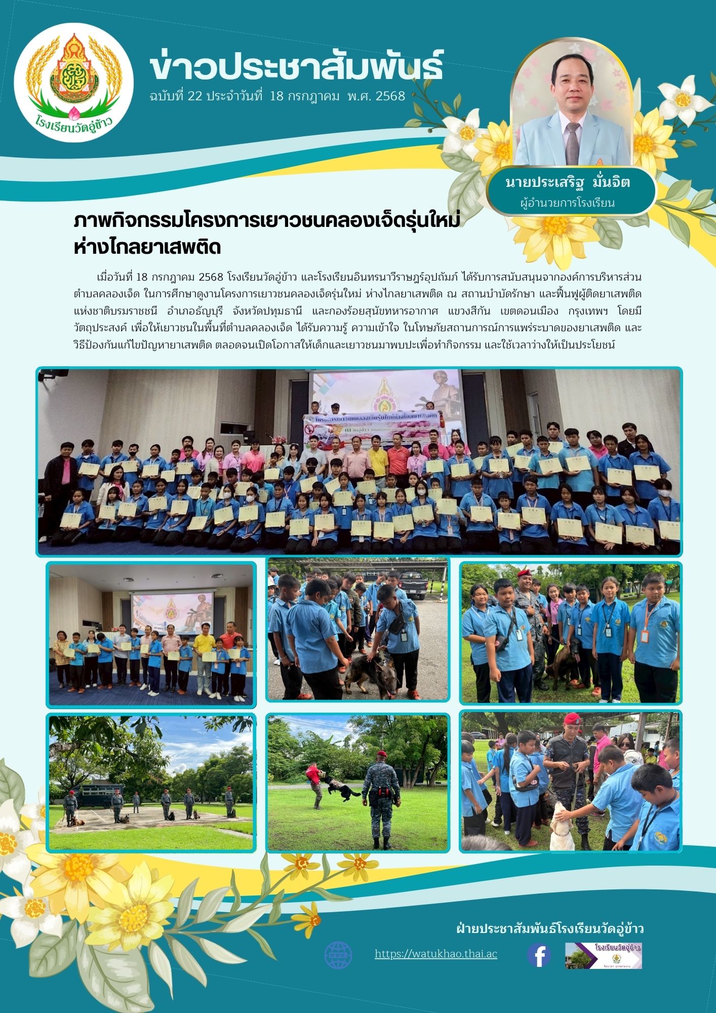 โรงเรียนวัดอู่ข้าว ขอขอบคุณองค์การบริหารส่วนตำบลคลองเจ็ด ในการจัดกิจกรรมศึกษาดูงานโครงการเยาวชนคลองเจ็ดรุ่นใหม่ ห่างไกลยาเสพติด ขึ้น ณ สถานบำบัดรักษา และฟื้นฟูผู้ติดยาเสพติดแห่งชาติบรมราชชนี อำเภอธัญบุรี จังหวัดปทุมธานี และกองร้อยสุนัขทหารอากาศ แขวงสีกัน เขตดอนเมือง กรุงเทพฯ ในวันที่ 18 เดือนกรกฎาคม พ.ศ.2568 ????https://static.xx.fbcdn.net/images/emoji.php/v9/t80/1/16/1f64f.png" target="_blank">https://static.xx.fbcdn.net/images/emoji.php/v9/t80/1/16/1f64f.png" style="border-end-end-radius:0px; border-end-start-radius:0px; border-start-end-radius:0px; border-start-start-radius:0px; border:0px; height:16px; object-fit:fill; width:16px" />????https://static.xx.fbcdn.net/images/emoji.php/v9/t80/1/16/1f64f.png" target="_blank">https://static.xx.fbcdn.net/images/emoji.php/v9/t80/1/16/1f64f.png" style="border-end-end-radius:0px; border-end-start-radius:0px; border-start-end-radius:0px; border-start-start-radius:0px; border:0px; height:16px; object-fit:fill; width:16px" />