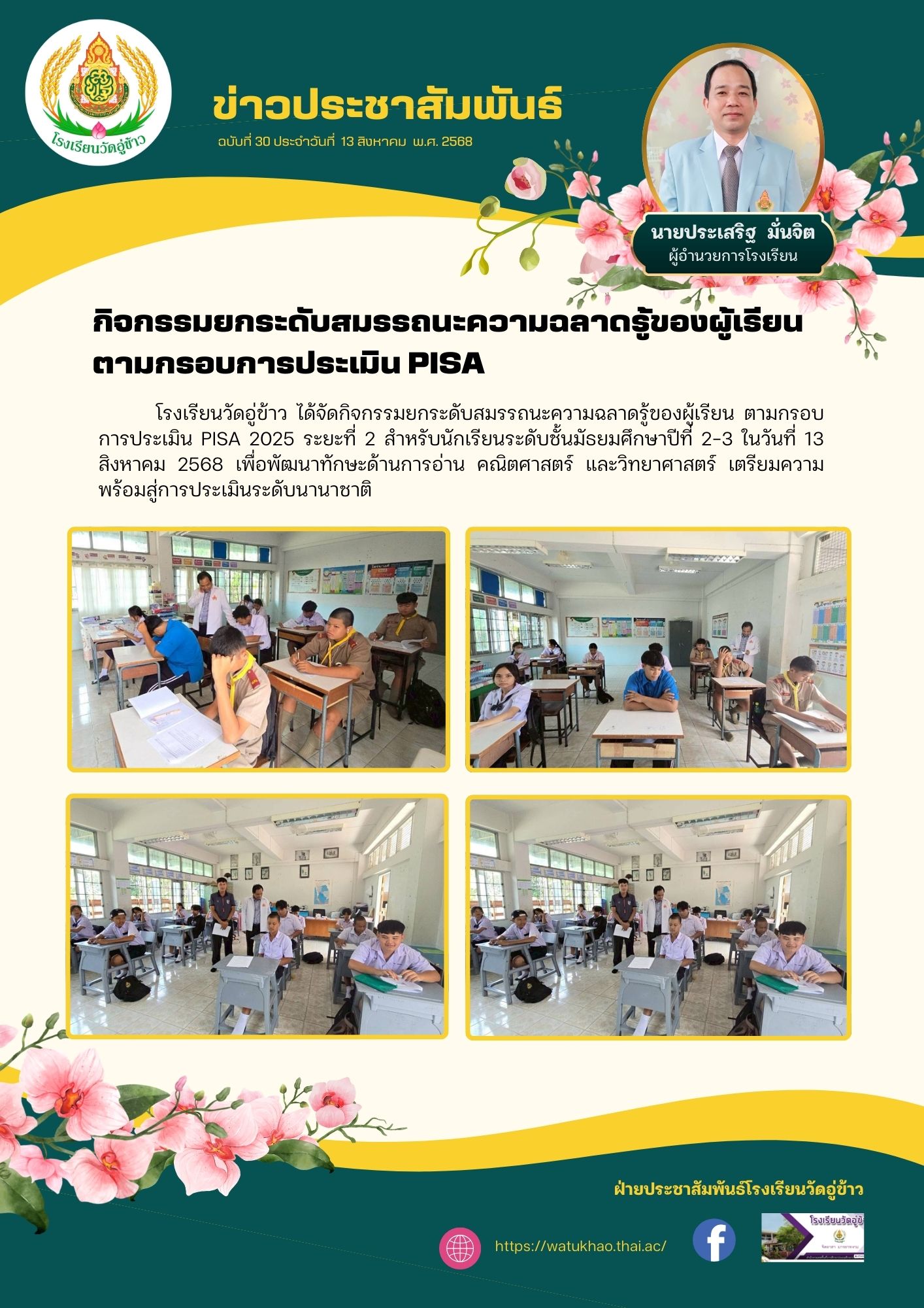 โรงเรียนวัดอู่ข้าว ได้จัดกิจกรรมยกระดับสมรรถนะความฉลาดรู้ของผู้เรียน ตามกรอบการประเมิน PISA 2025 ระยะที่ 2 สำหรับนักเรียนระดับชั้นมัธยมศึกษาปีที่ 2-3 ในวันที่ 13 สิงหาคม 2568 เพื่อพัฒนาทักษะด้านการอ่าน คณิตศาสตร์ และวิทยาศาสตร์ เตรียมความพร้อมสู่การประเมินระดับนานาชาติ