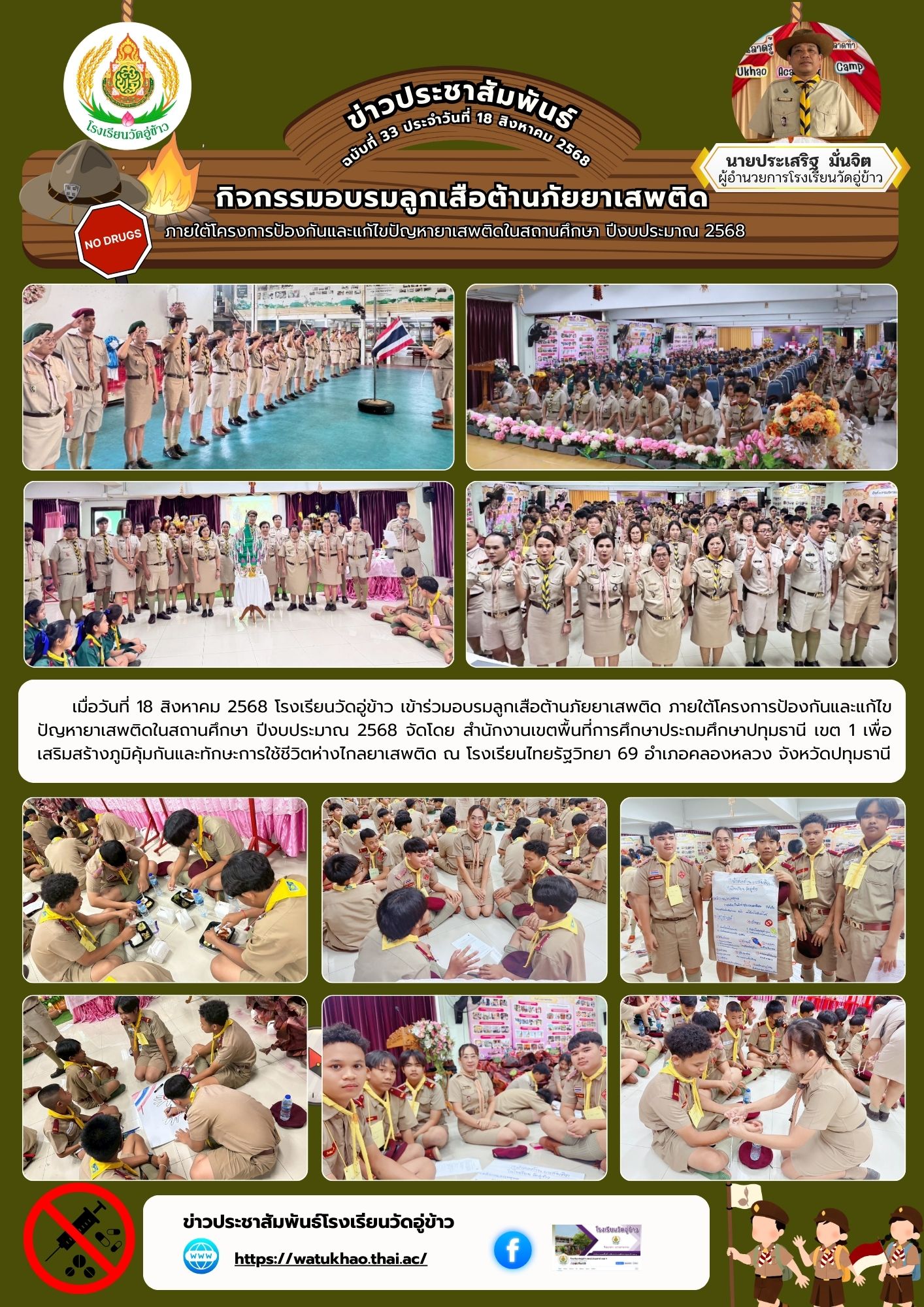 เมื่อวันที่ 18 สิงหาคม 2568 โรงเรียนวัดอู่ข้าว เข้าร่วมอบรมลูกเสือต้านภัยยาเสพติด ภายใต้โครงการป้องกันและแก้ไขปัญหายาเสพติดในสถานศึกษา ปีงบประมาณ 2568 จัดโดย สำนักงานเขตพื้นที่การศึกษาประถมศึกษาปทุมธานี เขต 1 เพื่อเสริมสร้างภูมิคุ้มกันและทักษะการใช้ชีวิตห่างไกลยาเสพติด ณ โรงเรียนไทยรัฐวิทยา 69 อำเภอคลองหลวง จังหวัดปทุมธานี
