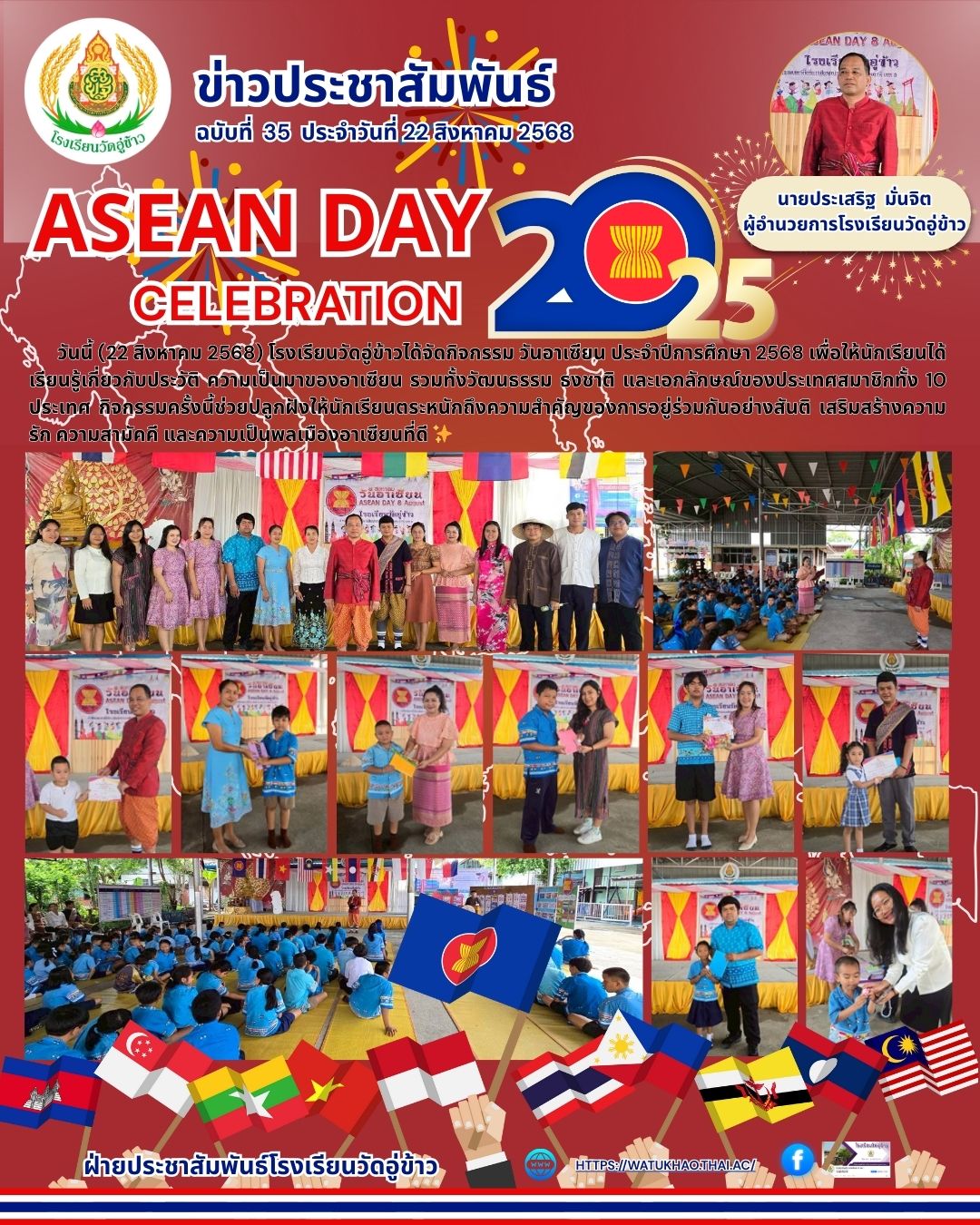 วันนี้ (22 สิงหาคม 2568) โรงเรียนวัดอู่ข้าวได้จัดกิจกรรม วันอาเซียน ประจำปีการศึกษา 2568 เพื่อให้นักเรียนได้เรียนรู้เกี่ยวกับประวัติ ความเป็นมาของอาเซียน รวมทั้งวัฒนธรรม ธงชาติ และเอกลักษณ์ของประเทศสมาชิกทั้ง 10 ประเทศ กิจกรรมครั้งนี้ช่วยปลูกฝังให้นักเรียนตระหนักถึงความสำคัญของการอยู่ร่วมกันอย่างสันติ เสริมสร้างความรัก ความสามัคคี และความเป็นพลเมืองอาเซียนที่ดี ?https://static.xx.fbcdn.net/images/emoji.php/v9/tf4/1/16/2728.png" style="border-end-end-radius:0px; border-end-start-radius:0px; border-start-end-radius:0px; border-start-start-radius:0px; border:0px; height:16px; object-fit:fill; width:16px" />