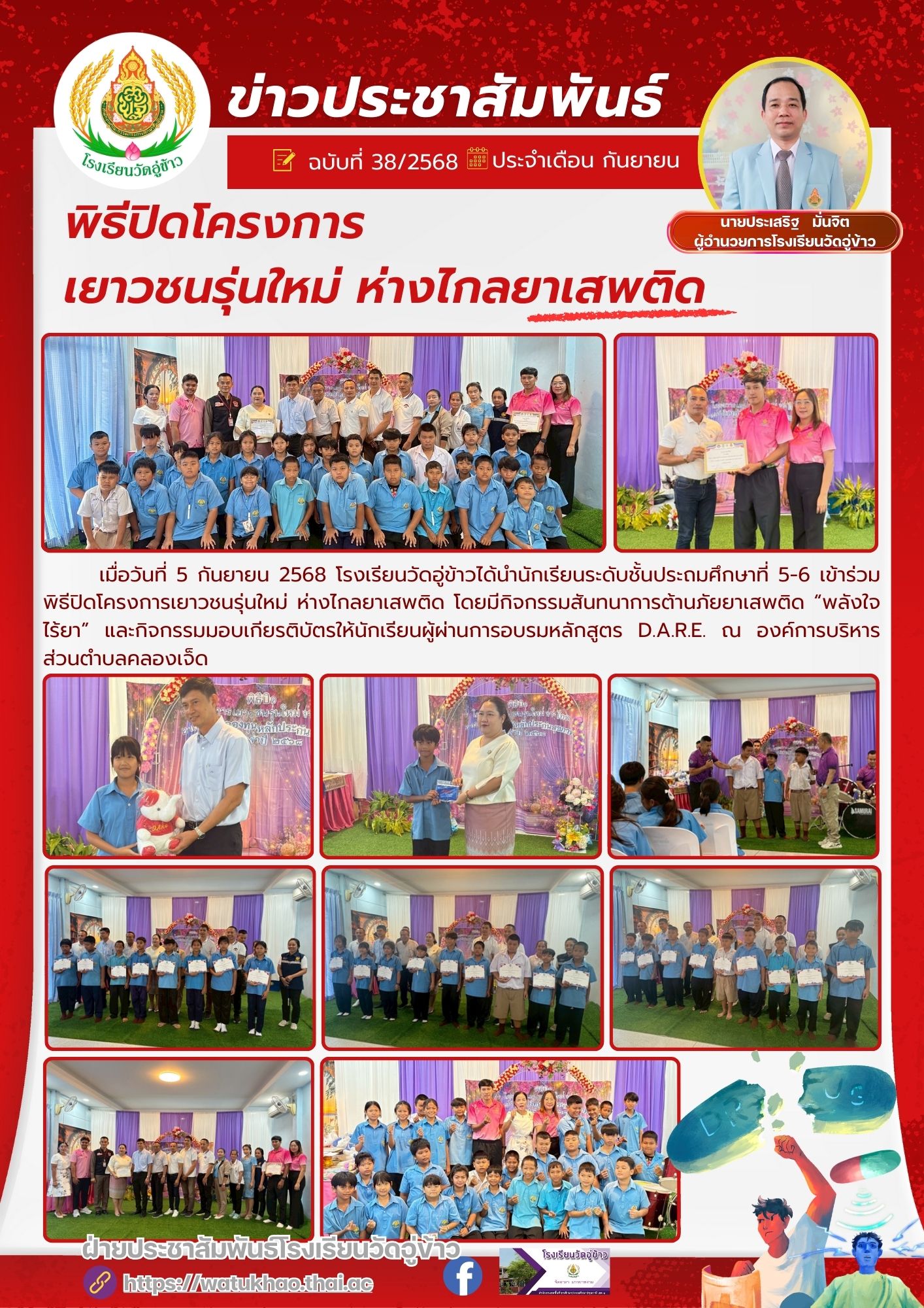 เมื่อวันที่ 5 กันยายน 2568 โรงเรียนวัดอู่ข้าว ได้นำนักเรียนระดับชั้นประถมศึกษาที่ 5-6 เข้าร่วมพิธีปิดโครงการเยาวชนรุ่นใหม่ ห่างไกลยาเสพติด โดยมีกิจกรรมสันทนาการต้านภัยยาเสพติด “พลังใจไร้ยา” และกิจกรรมมอบเกียรติบัตรให้นักเรียนผู้ผ่านการอบรมหลักสูตร D.A.R.E. ณ องค์การบริหารส่วนตำบลคลองเจ็ด