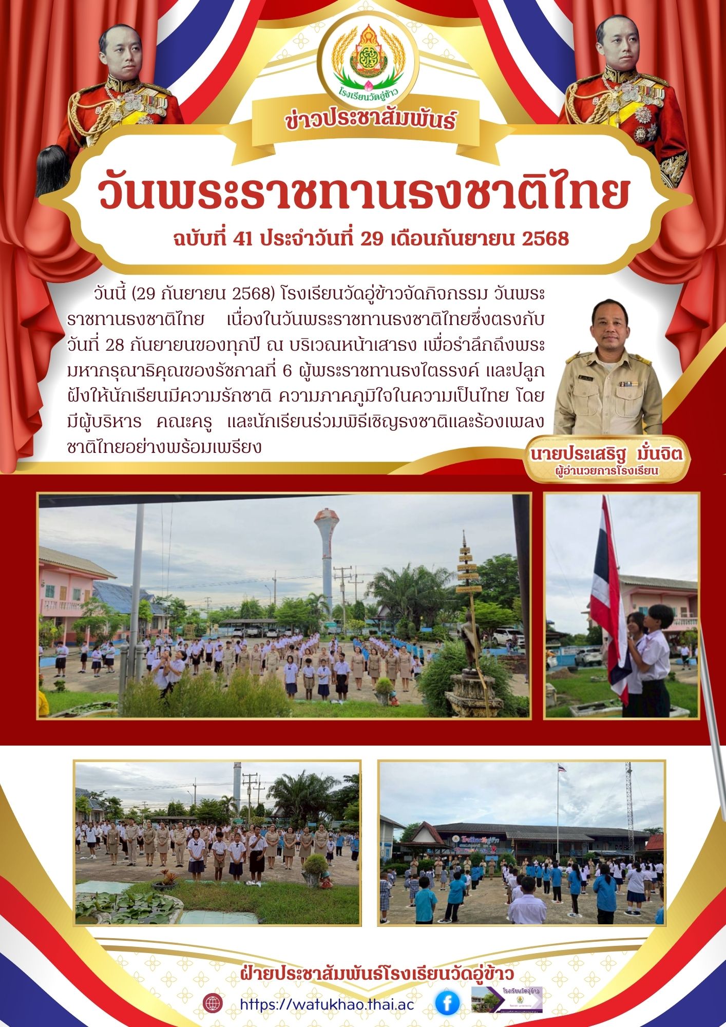 วันนี้ (29 กันยายน 2568) จัดกิจกรรม วันพระราชทานธงชาติไทย เนื่องในวันพระราชทานธงชาติไทยซึ่งตรงกับวันที่ 28 กันยายนของทุกปี ณ บริเวณหน้าเสาธง เพื่อรำลึกถึงพระมหากรุณาธิคุณของรัชกาลที่ 6 ผู้พระราชทานธงไตรรงค์ และปลูกฝังให้นักเรียนมีความรักชาติ ความภาคภูมิใจในความเป็นไทย โดยมีผู้บริหาร คณะครู และนักเรียนร่วมพิธีเชิญธงชาติและร้องเพลงชาติไทยอย่างพร้อมเพรียง